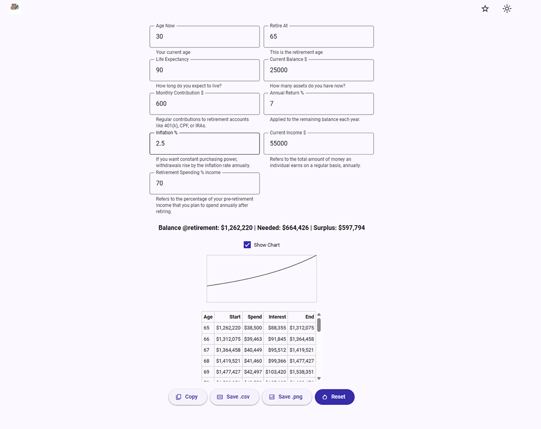 Built for flexibility and precision, the app accounts for common retirement savings structures, including CPF, 401(k), and other investment strategies. No matter how you build your nest egg, Retirement Path adapts to your financial habits, giving you actionable insights tailored to your personal situation. With clear charts and easy-to-understand outputs, making informed financial decisions has never been simpler.